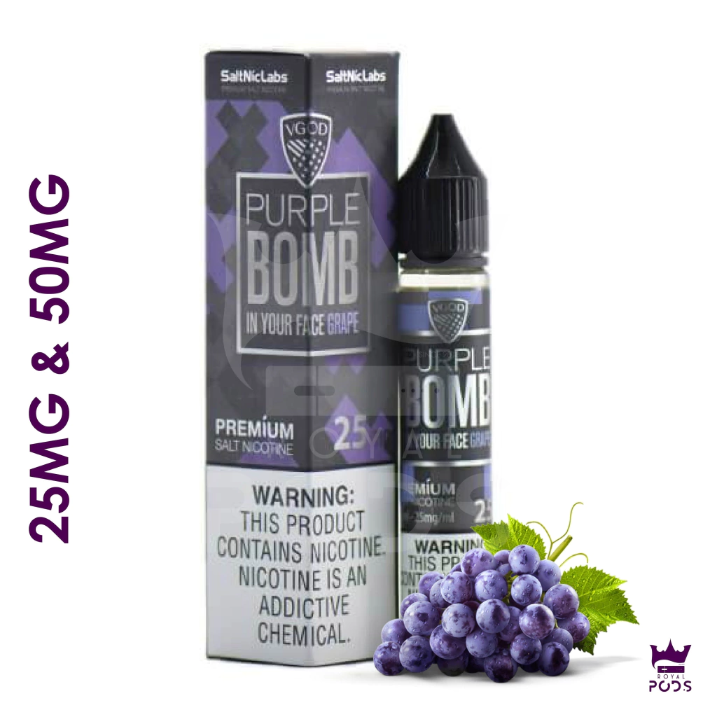 Purple Bomb SaltNic de VGOD es una mezcla perfecta con un racimo de uvas Concord dulcemente maduras y crujientes recién arrancadas de la vid con toques de caramelo de uva azucarado para el final. Purple Bomb otorga ráfagas de uvas auténticas con dulzura recubierta de azúcar para una experiencia de vapeo perfecta durante todo el día. Purple Bomb SaltNic de VGOD está disponible en concentraciones de nicotina de 25 mg o 50 mg para su dispositivo de cápsula recargable de bajo voltaje favorito.